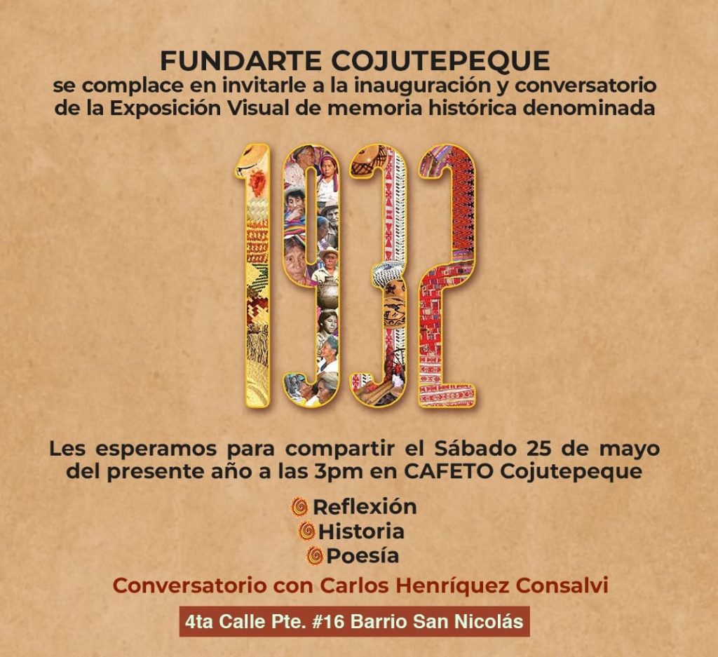 Bajo iniciativa de Fundarte, se inauguró la exposición “1932”, con charla ofrecida por Carlos Henríquez Consalvi director del Museo de la Palabra y la Imagen, quien disertó sobre las causas del levantamiento indígena y campesino, y respondió preguntas de los presentes sobre el proceso que impulsó el Museo de la Palabra y la Imagen para la realización de la película y las publicaciones que ha producido sobre estos sucesos históricos. Conducida por Juan Olano, la actividad se desarrolló en el centro cultural Cafeto Cojutepeque, el cual ha habilitado luminarias y espacios para exposiciones artísticas.