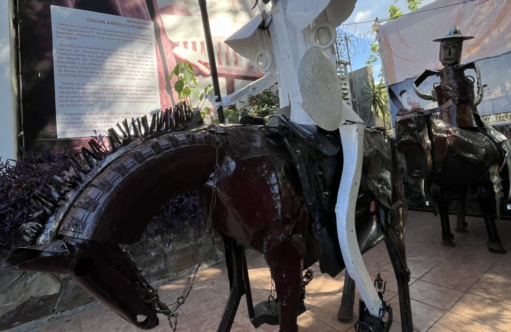 San Salvador, viernes 1 de noviembre de 2024. La monumental escultura del Quijote de la Mancha recorre la esplanada del Museo de la Palabra y la Imagen (MUPI), seguido por su fiel escudero Sancho Panza, bajo la gigantografía de Monseñor Romero que custodia un espacio de memoria. Esculturas creadas por el artista autodidacta Alfredo Melara Farfán (1911- 2000), originario de Atiquizaya, departamento de Ahuachapán, cuyas obras están diseminadas en diversas partes del mundo, reconocido por su habilidad para transformar materiales metálicos en expresivas piezas de arte.