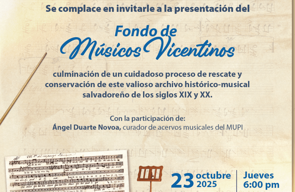 San Salvador, lunes 20 de octubre de 2025. El Museo de la Palabra y la Imagen (MUPI) realizará la presentación oficial del Fondo de Músicos Vicentinos (FMV), una valiosa colección que rescata y preserva una parte esencial del patrimonio cultural e histórico de El Salvador.