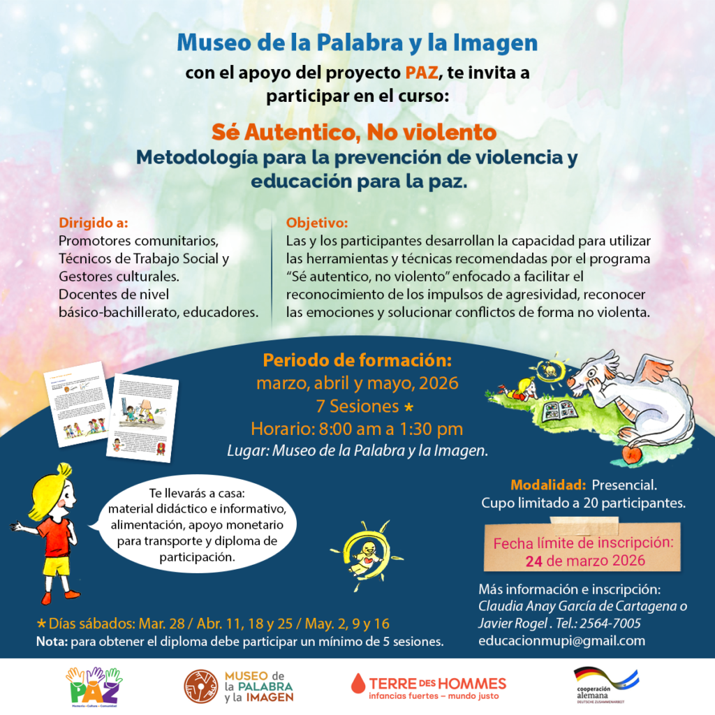 Marzo de 2026. El MUPI inició el pasado 28 de marzo, la primer sesión del curso gratuito «Sé auténtico, no violento» metodología participativa para la prevención de violencia y educación para la paz, dirigido a docentes de nivel básico-bachillerato, educadores, promotores comunitarios, técnicos de trabajo social y gestores culturales. El curso de modalidad presencial, es facilitado por Claudia Anay García, Javier Rogel, Laura García, con el apoyo de BMZ TDH Alemania.